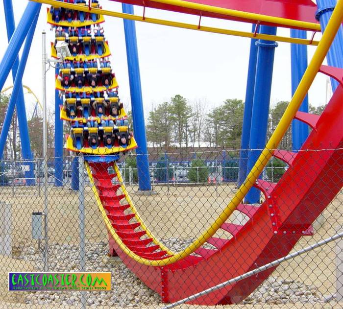 This design has also been used at two other six flags parks.. The only coaster of its kind in the northeast! At a whopping 77 miles per hour, you will zoom through a staggering 5,400 feet of twisting red track that will truly give you.
